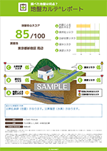 「地盤カルテ®」は、住所等を入力するだけで、全国どこでも5項目の地盤・災害リスクの指標について、各A4用紙1枚にまとめたレポートを無料でメールで受信できるサービスです。ハザードマップ等ではわかりにくい地盤・災害リスク情報について、各項目のスコアおよび合計スコアをわかりやすく点数化して表示していますので、専門的な知識がなくとも土地のリスク情報の概要を把握することができます。